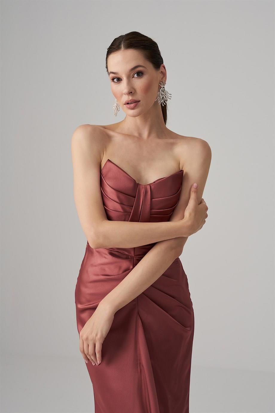 SAGRANDE Ella derin yırtmaçlı straplez yaka bant kol saten uzun elbise