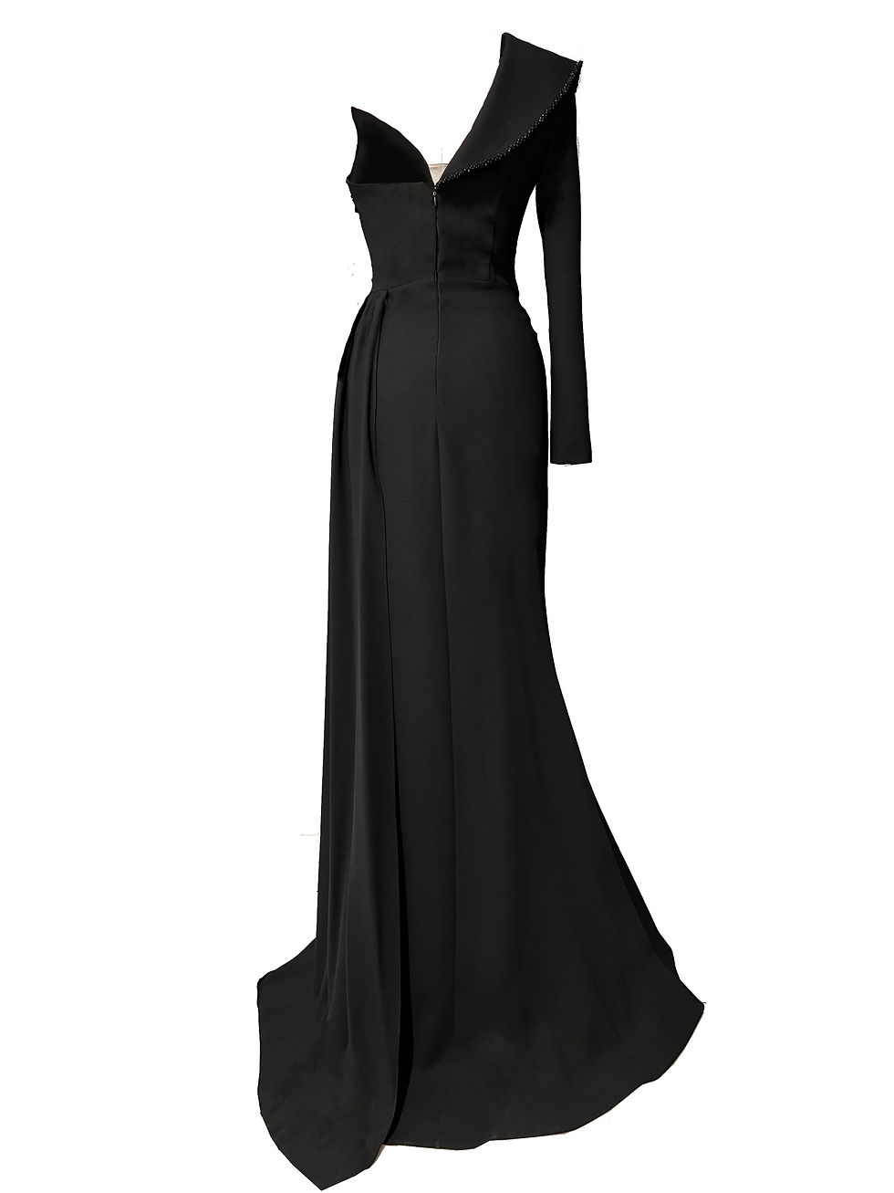 SAGRANDE 3190 Tek omuz asimetrik erkek yaka kristal işli dantel krep uzun abiye