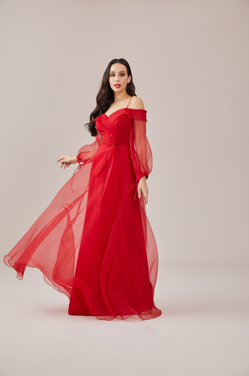 SAGRANDE kırmızı ip askılı uzun balon kollu kuşak kemerli a kesim organze elbise